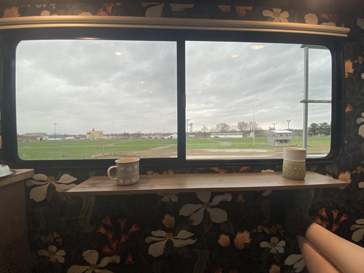 We installed another drop leaf shelf on the back wall. Our recliners rotate so we can spin them around, enjoy the view, and set up a happy “coffee time” space for mornings. Todays view isn’t that great but there will be better views to come!