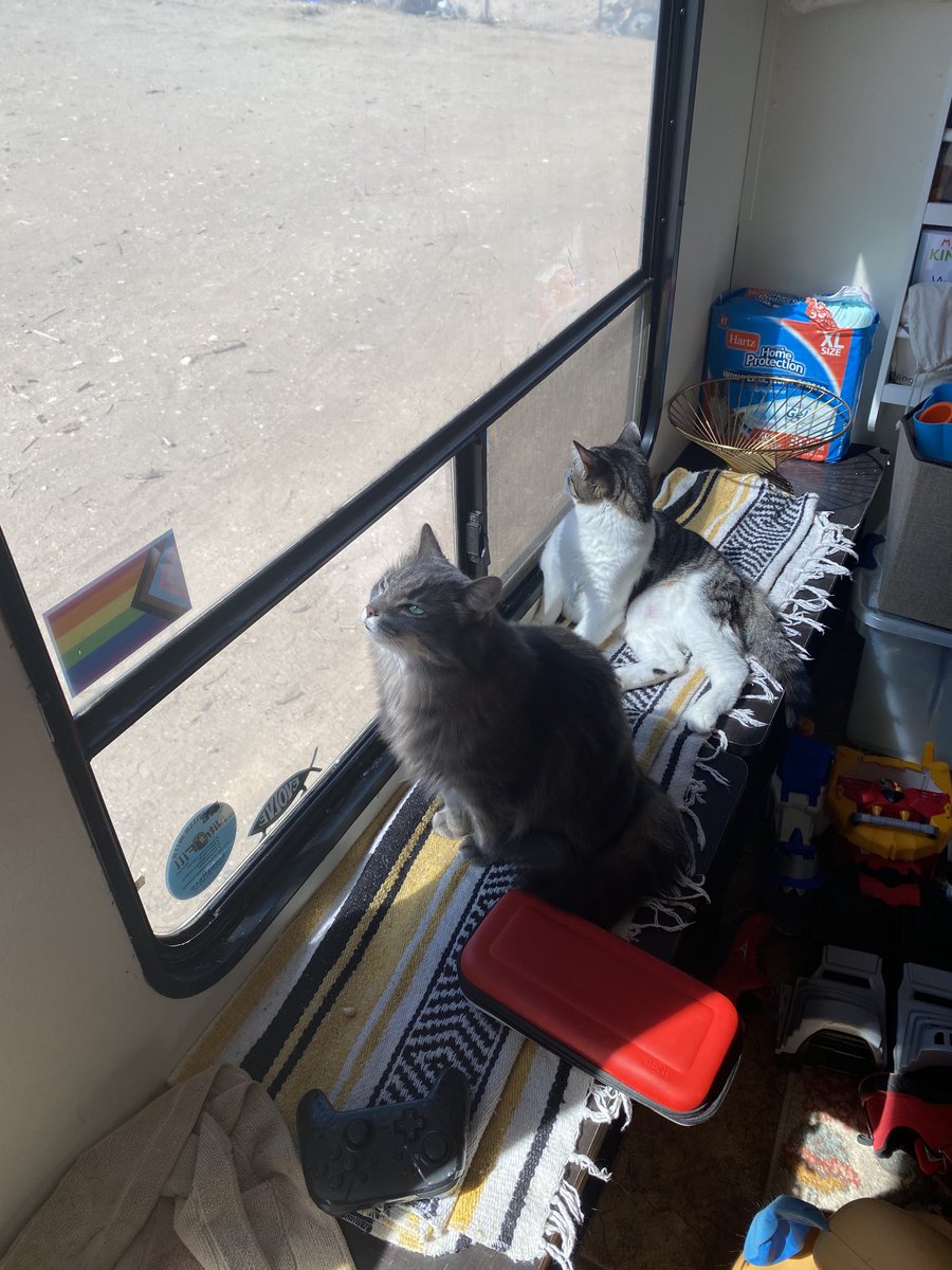 I frequently am asked “how do your cats do in the camper?” As-if they would dislike it. They both LOVE it. Cats spend a lot of time looking out the window. In our world, what’s outside the window is different pretty darn often.