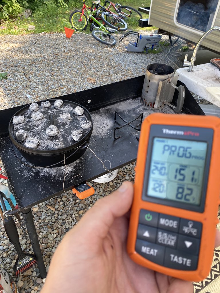 My new favorite oven/cooktop rig with charcoal. Dutch oven, lid stand, skillet